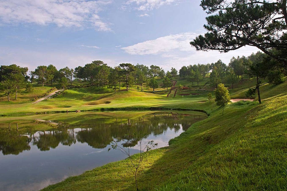 In 1994 Dalat emerged again as the ideal golf retreat in Southeast Asia. The 18- hole golf Course is crafted into the area’s rolling hills, surrounded by stately pine trees and seated above the majestic lake Xuan Huong.Dalat has been known for decades as the City of Eternal Spring. This is due to its year round cool crisp mountain climate. The course weaves its way through stately pine trees to oversized and delicately manicured bent grass greens.